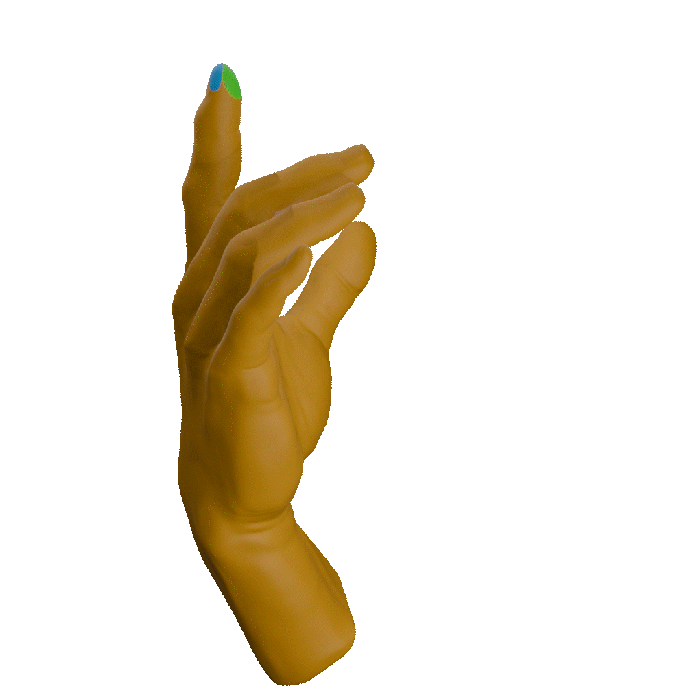 Handposition: loose fist, fingers curled, I extended